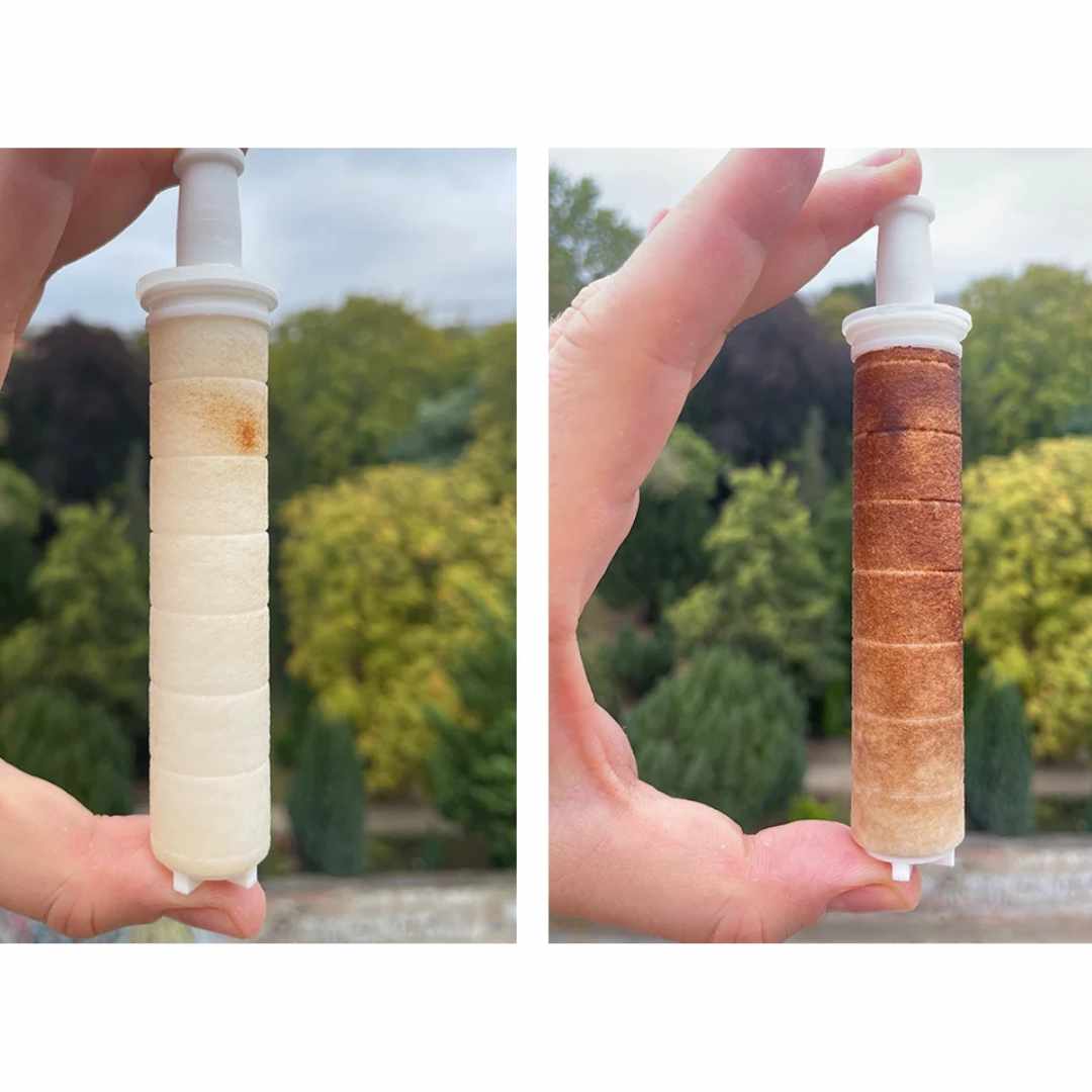 Nach nur zwei Monaten zeigt der Filter deutlich, was er für dich leistet: Während er anfangs strahlend weiß ist, wird er nach einigen Wochen sichtbar dunkler – ein Zeichen dafür, wie viel Schmutz, Kalk und Chlor er aus deinem Wasser herausfiltert.